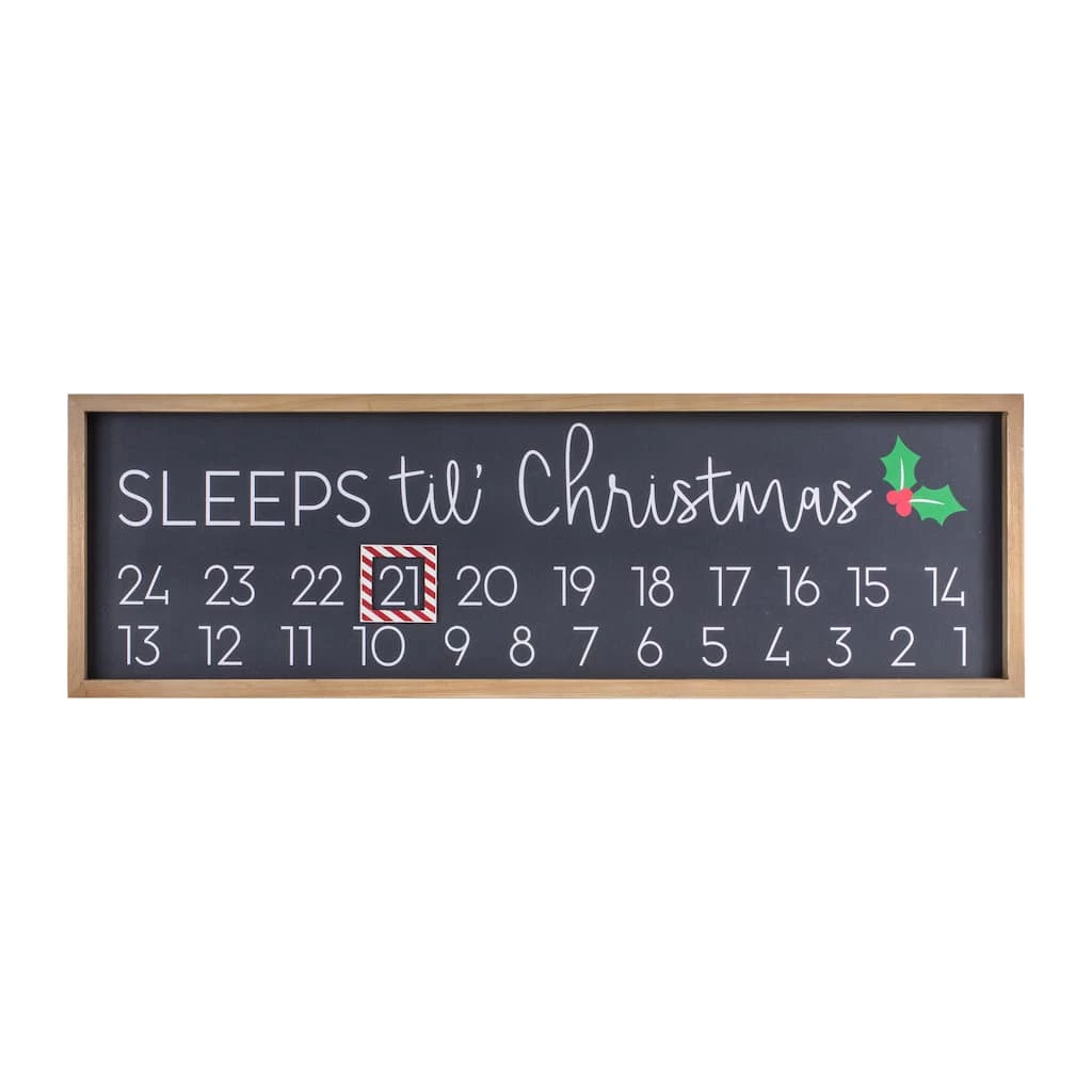 Count down the days until Christmas with this beautiful Christmas Countdown Sign. Featuring the sentiment “Sleeps Til Christmas”, the classic black finish paired with the natural wooden frame and holly leaf accent makes the piece a great addition to any style of holiday dΓ©cor. The quality fir wood and MDF composition is sure to last for seasons to come. Display the piece in your living room, kitchen, or other high-traffic areas of your home to be sure you can count down each day at a time.