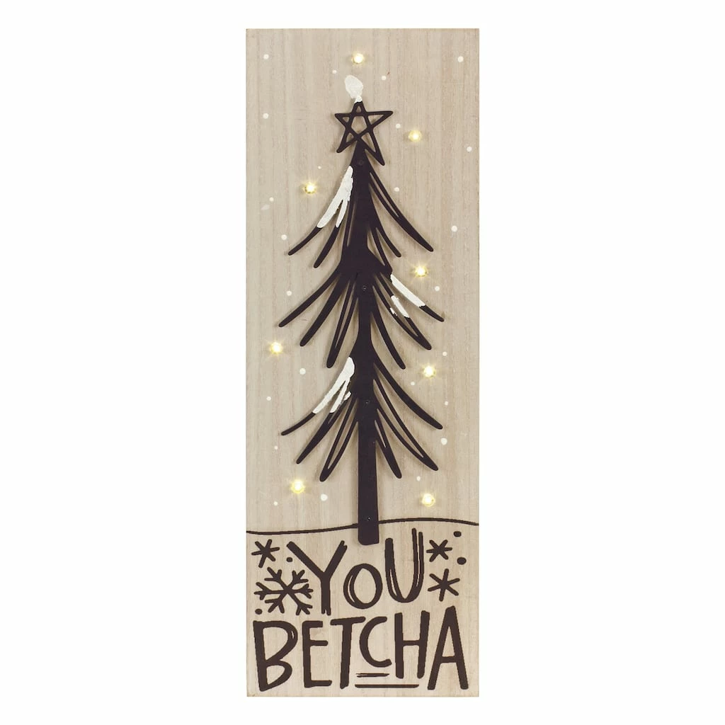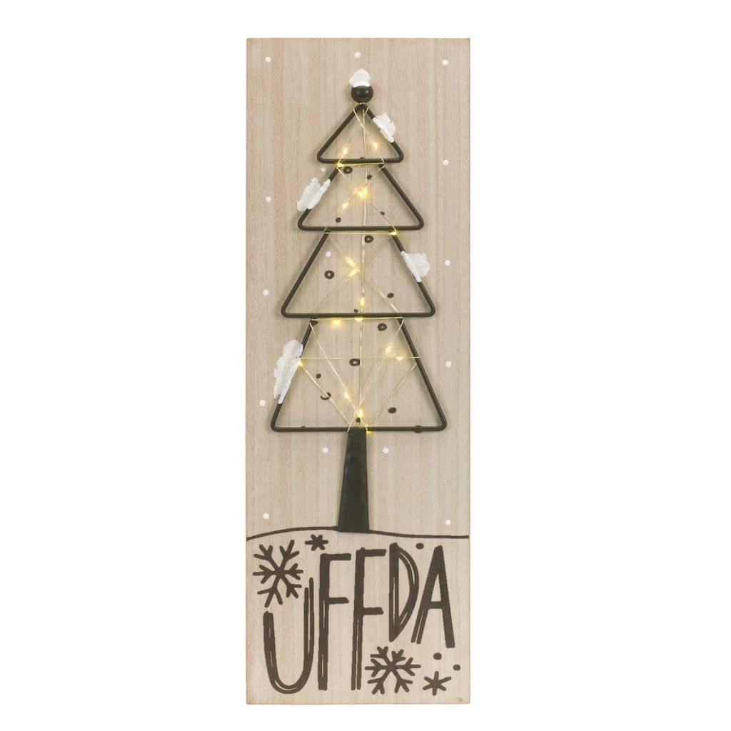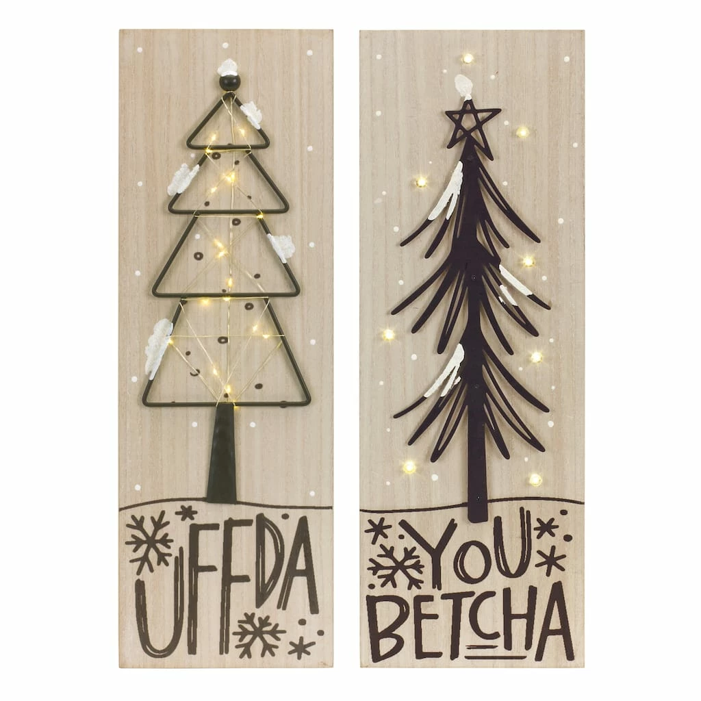 Welcome your guests with this beautiful set of LED Midwest Phrase Christmas Signs. Featuring the sentiments “You Betcha” and “Uffda”, the Midwesterners will know these phrases all too well. The faux wooden finish paired with the whimsical tree design and “snowy” accents is the perfect combination to create a stunning Christmas display.