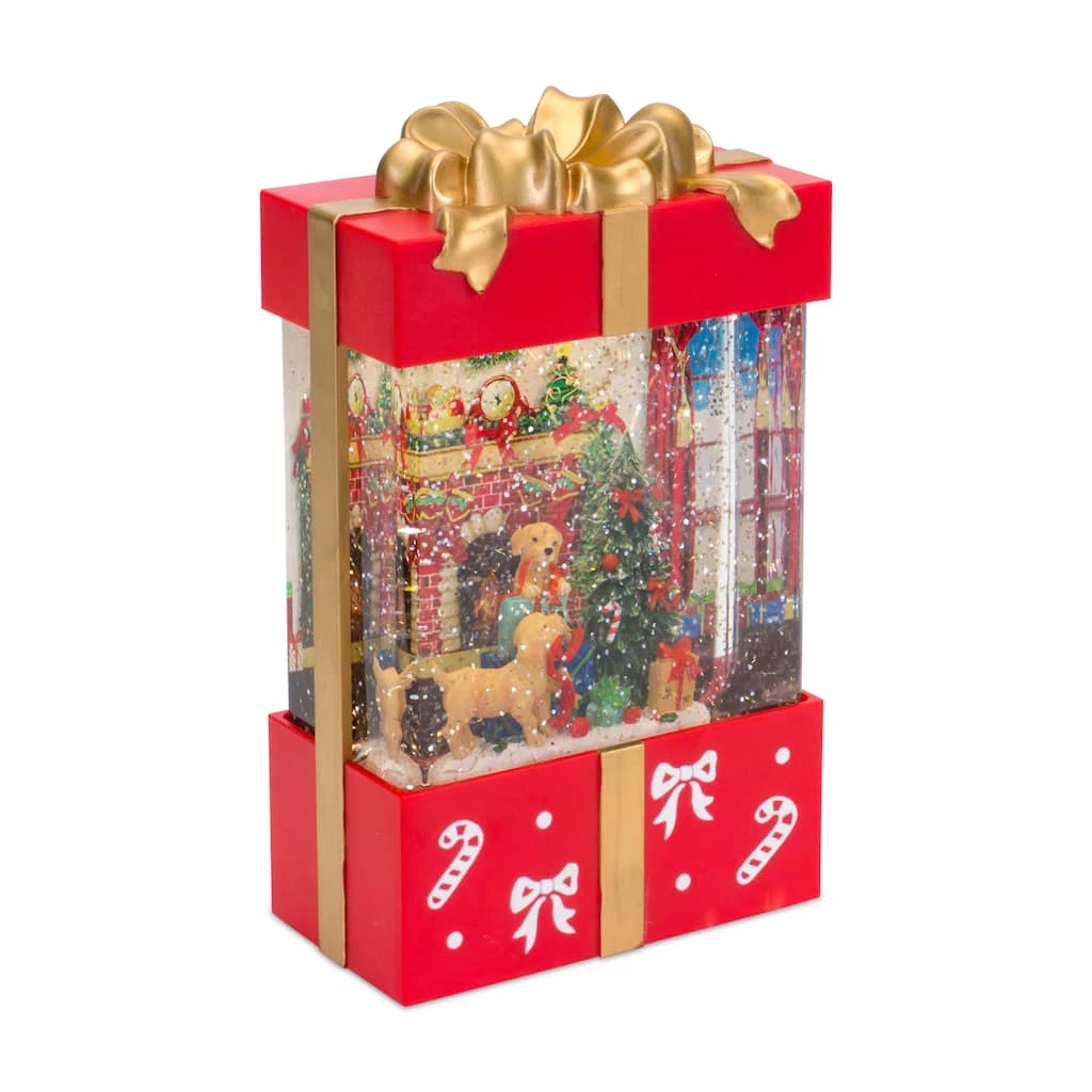 Illuminate your home this Christmas season with the stunning Lighted Present Snow Globe with Dog and Christmas Tree scene. This piece features a puppy dog Christmas scene inside of a present-shaped snow globe. The traditional wrapped present design paired with the sparkly globe contents makes this set a great addition to any style of holiday dΓ©cor.