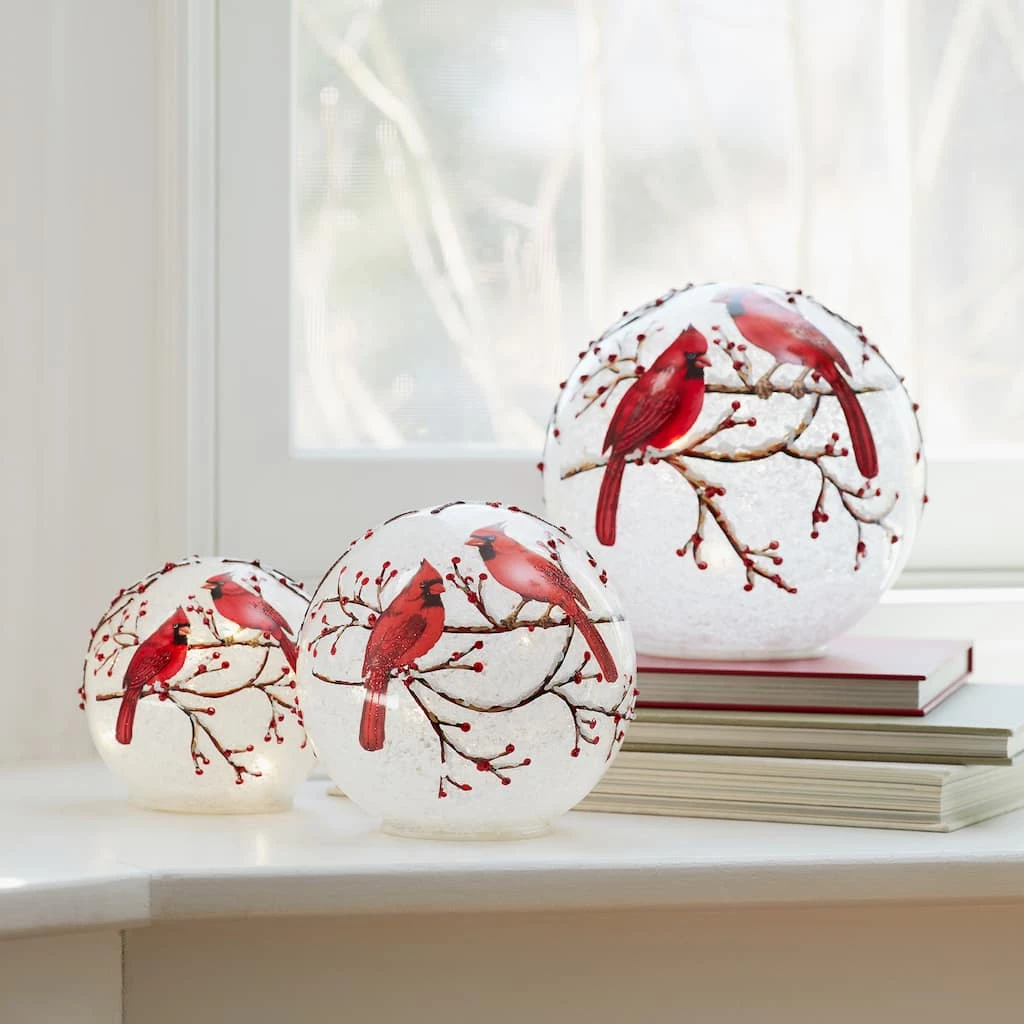 Illuminate your home with this stunning set of LED Cardinal Globes. Featuring three assorted sizes, this set will make a great addition to your Christmas dΓ©cor. The quality glass composition paired with the bright LED lighted technology is the perfect combination to create a stunning display. Batteries not included.