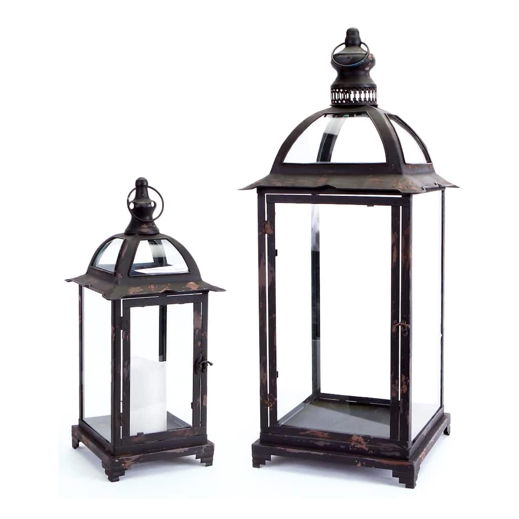 Welcome your guests with this beautiful set of decorative lanterns. Its traditional design paired with the rustic weathered finish is the perfect combination to make a stunning piece. The lanterns are a great addition to both every day and seasonal home dΓ©cor. The sturdy metal composition is sure to last for seasons to come. Just add real wax or LED candles to illuminate the piece. It also makes a great canvas for DIY faux floral arrangements.