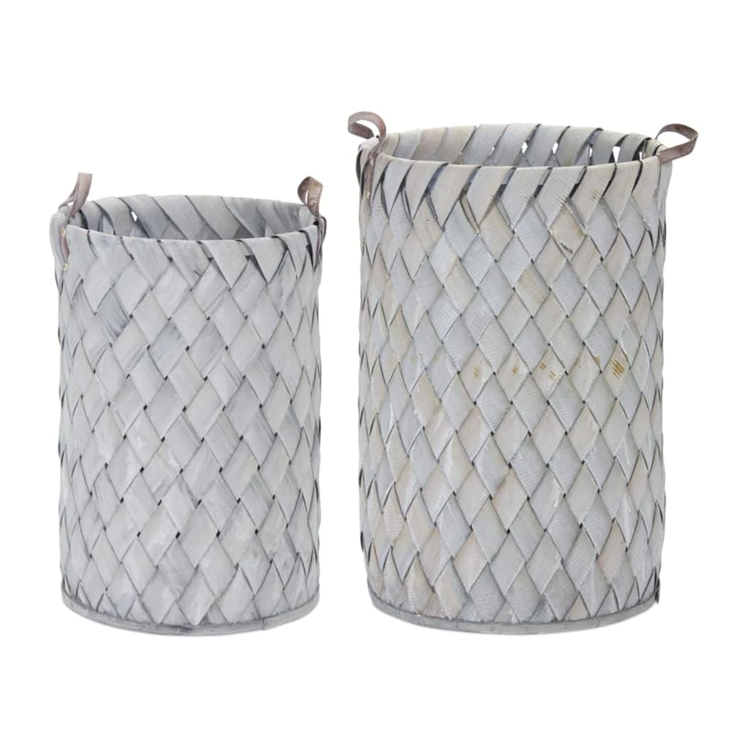 These oversized woven baskets offer added storage for any room. They are comprised of exceptional craftsmanship with faux leather handles and whitewash finish.