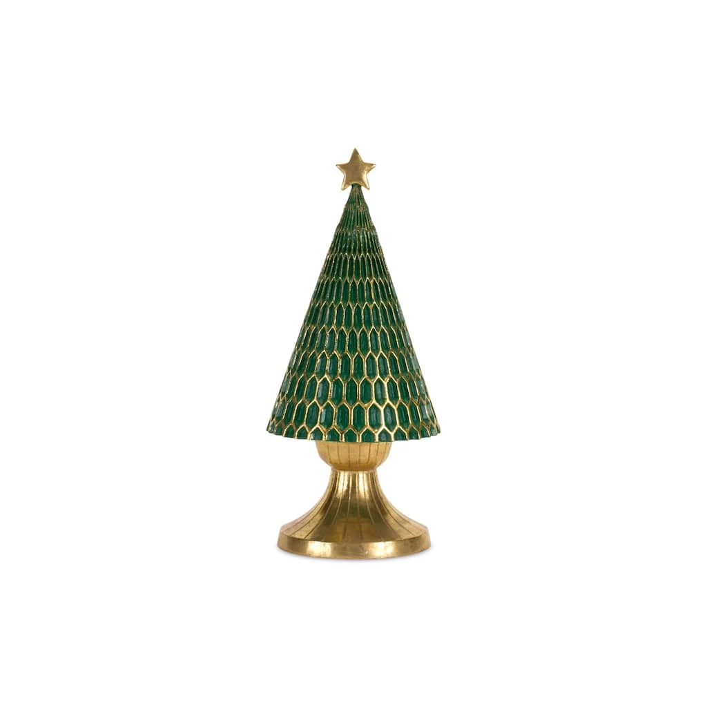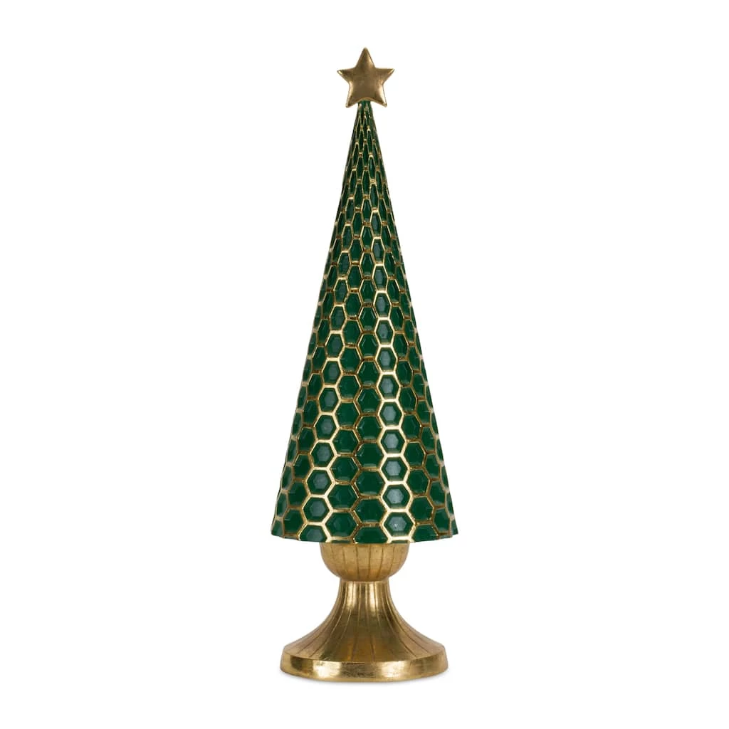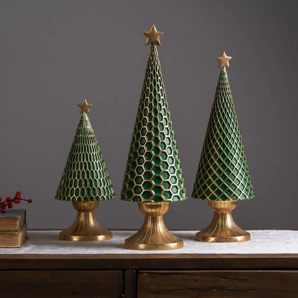 Enhance your holiday home dΓ©cor with this beautiful set of green and gold resin trees. Featuring three sizes, the ornate patterned designs paired with golden accents make this piece the perfect addition to your Christmas dΓ©cor. Display the pieces in a table centerpiece or mantel arrangement to add interest.