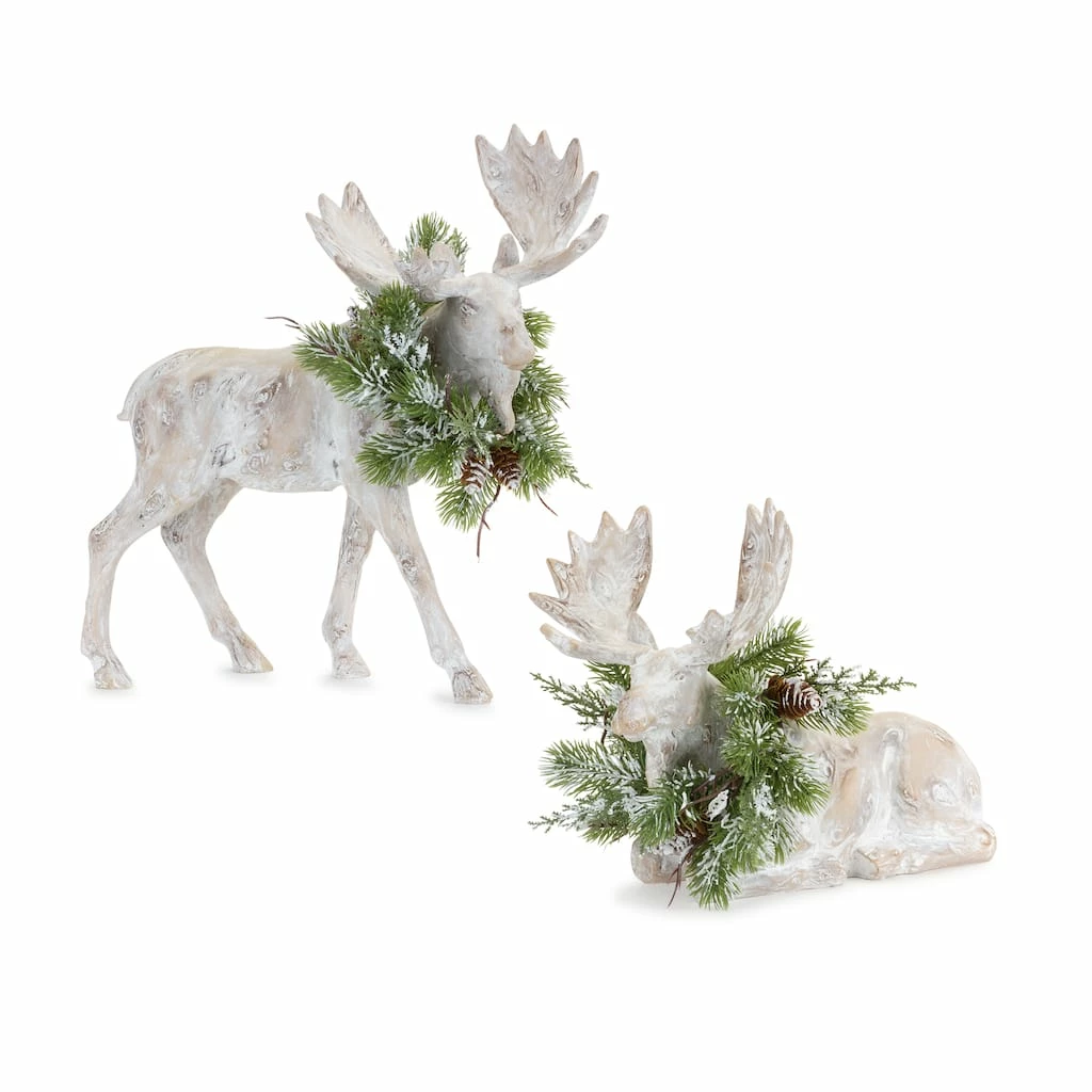 Add a modern touch of nature to your holiday dΓ©cor with this beautiful set of moose figurines. Featuring two assorted sizes, the white-washed finish paired with the pine wreath accent is the perfect combination to create a stunning Christmas display. The quality polyresin and stone powder composition is sure to last for seasons to come. Display the pieces together to make a statement, or display them alongside your other holiday dΓ©cor to add character to the space.